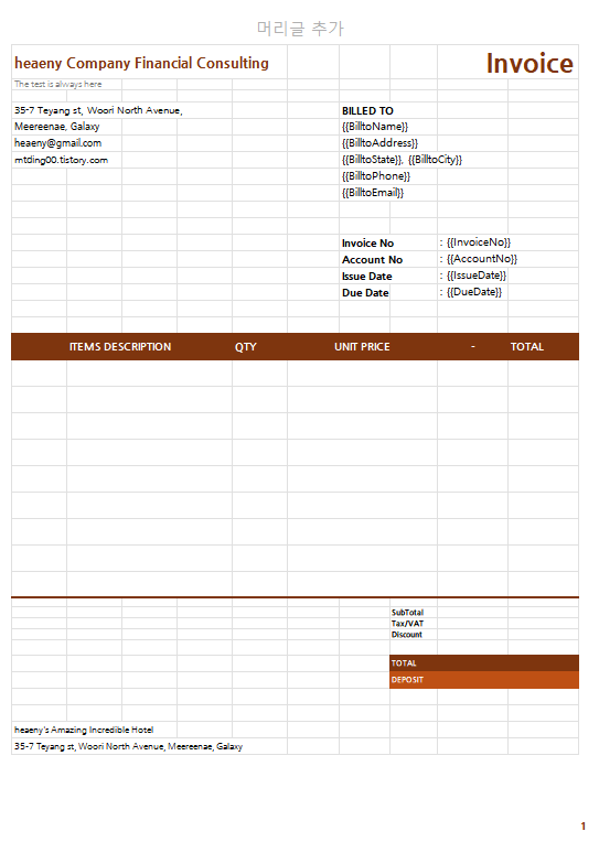 따라서, 필자는 이번 포스팅을 위해 Invoice(송장) 문서 양식을 작성해 보았다. 기본 개념 전에 이 자료부터 확보하는 것이 우선인 것 같아 제작하게 되었으며, 필자의 경험(여기저기서 Invoice 문서를 본 경험)을 토대로 최대한 현실적인, 정보를 작성한 Invoice를 제작해보았다.