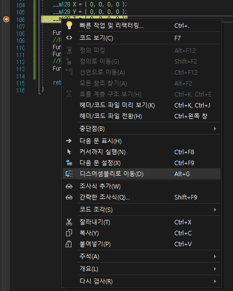 디버그 중단점은 F9를 누르면 생성, 파괴되는 것을 알 것이다. 그리고 그 중단 와중에 우클릭을 누르면 디스어셈블리로 이동할 수 있다.