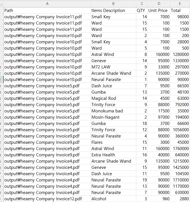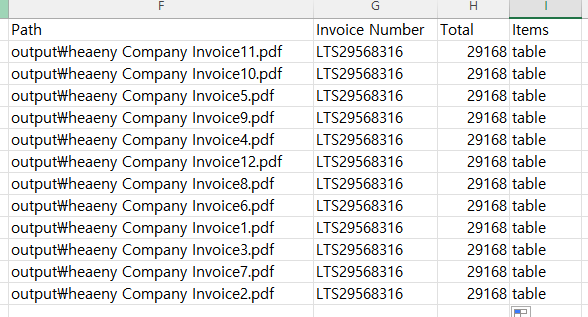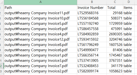 파싱영역은 개개별 달라지기에 따로 다루진 않겠다. 여튼 필자는 개별 필드일 때와 테이블일 때를 분리하여 합산한 후 시트에 뿌리는 방식으로 꾸몄다. 단, 이렇게 할 경우 문서가 병행처리 되기에 순서는 뒤죽박죽이 된다.