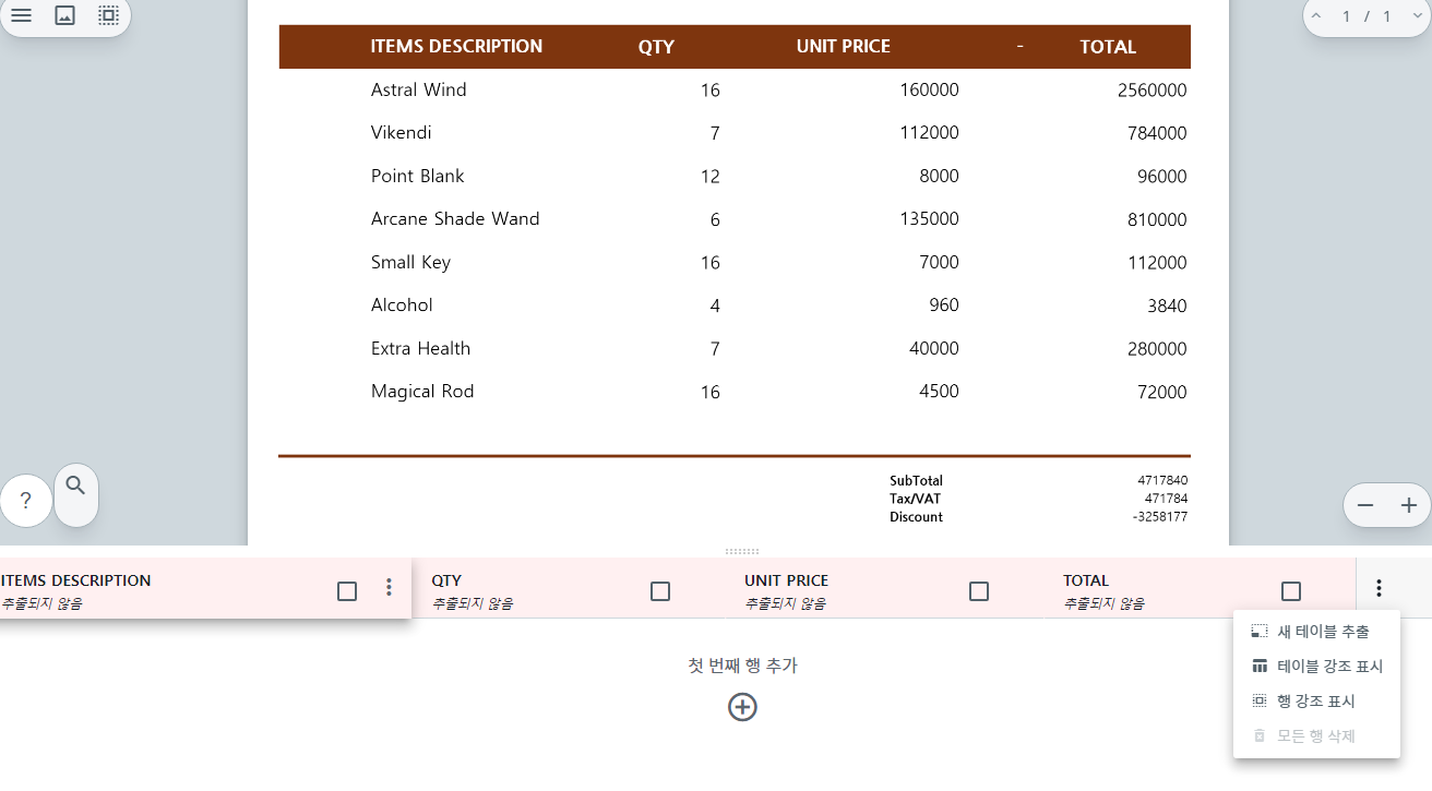 여기서부턴 간단하다. 우측 [REGULAR FIELDS]의 + 버튼을 눌러 추출하려는 필드(지금은 Invoice Number와 Total)를, 상단에 [COLUMN FIELDS]를 눌러 테이블(여기서는 ITEM FIELD다)을 추출하면 되겠다.