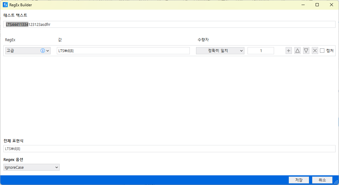 앞 세 글자는 [LTS] 이고 뒤는 총 8자리의 숫자로 이루어져 있다. 이를 정규식으로 표현하면 이렇다.