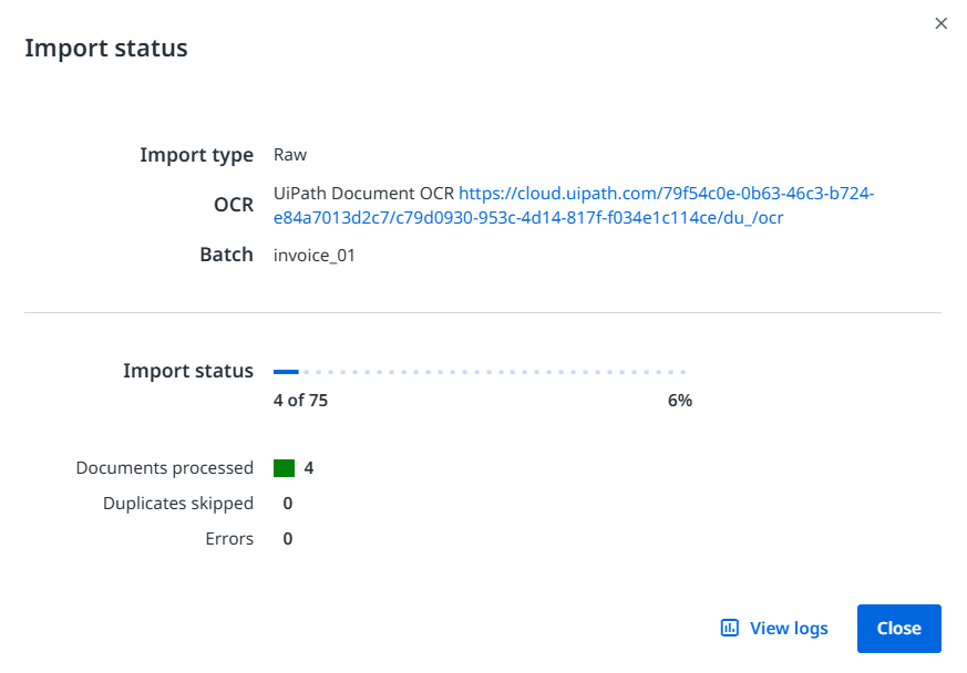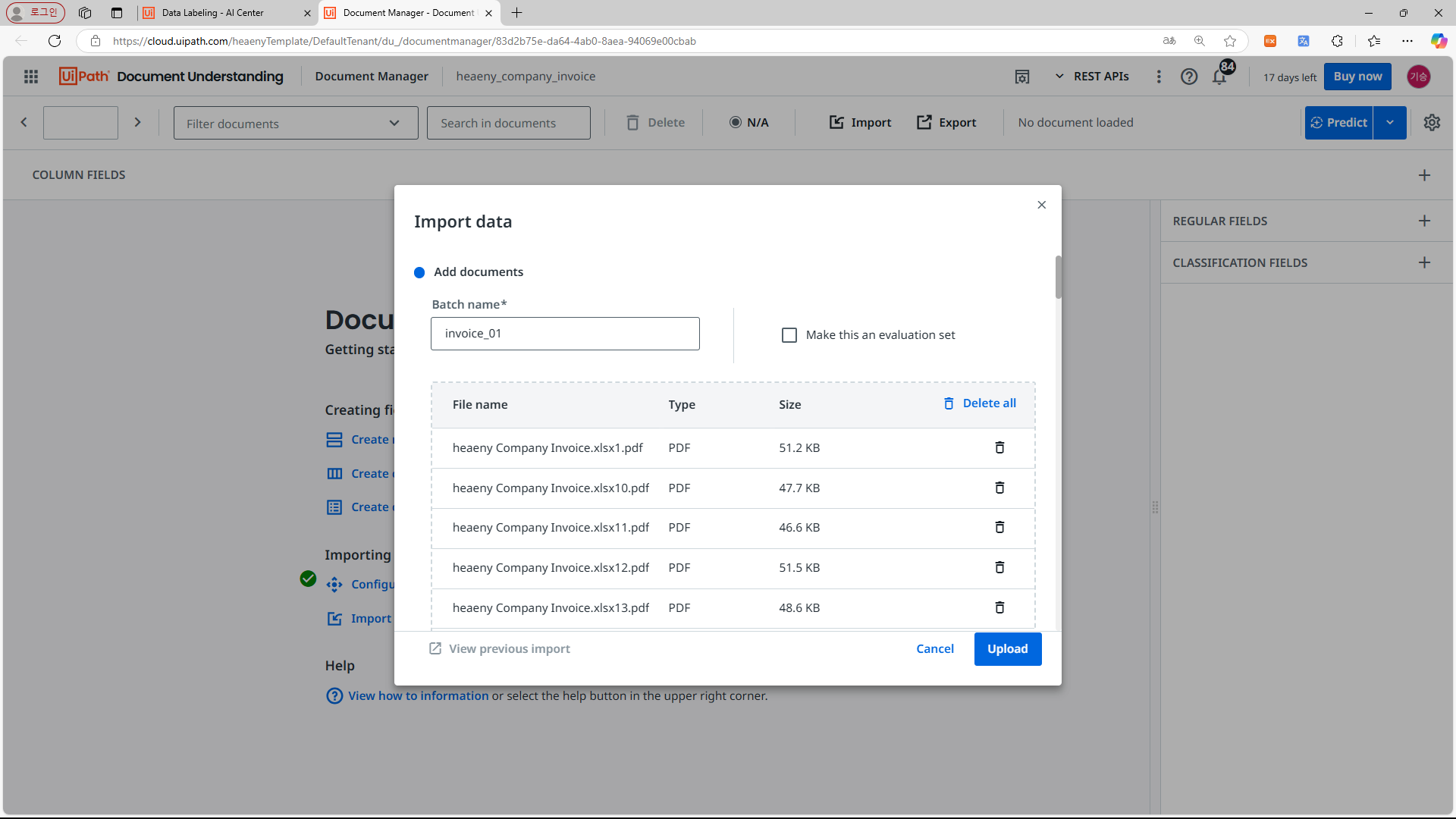 세션에 진입하면, 상단 가운데 쯤 있는 [Import] 버튼을 볼 수 있다. 필자는 미리 제공한 100개의 인보이스 중 75개만 학습용으로 쓰고 나머지 25개는 검증용으로 쓰겠다. 검증용은 [Make this an evaluation set] 버튼을 눌러 활성화하면 된다.