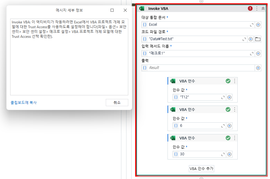Invoke VBA: 이 액티비티가 작동하려면 Excel에서 VBA 프로젝트 개체 모델에 대한 Trust Access를 사용하도록 설정해야 합니다(파일> 옵션> 보안 센터> 보안 센터 설정> 매크로 설정> VBA 프로젝트 개체 모델에 대한 Trust Access 선택 확인란).