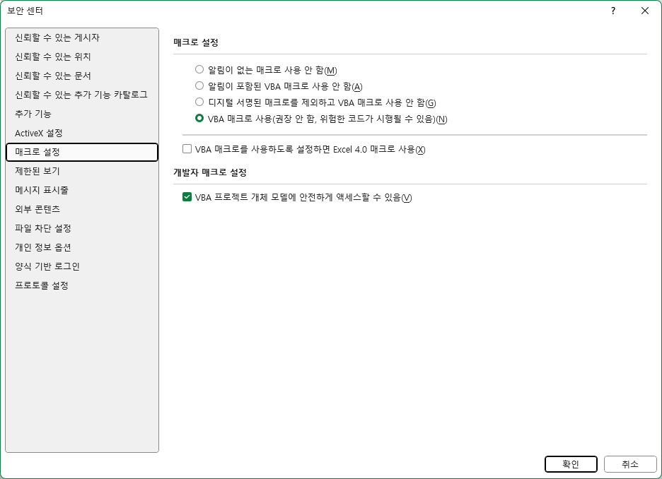액셀 열기 > 파일 > 옵션(좌측 하단) > 보안 센터 > 보안 센터 설정 > 매크로 설정 > [VBA 프로젝트 개체 모델에 안전하게 액세스할 수 있음] 활성화
